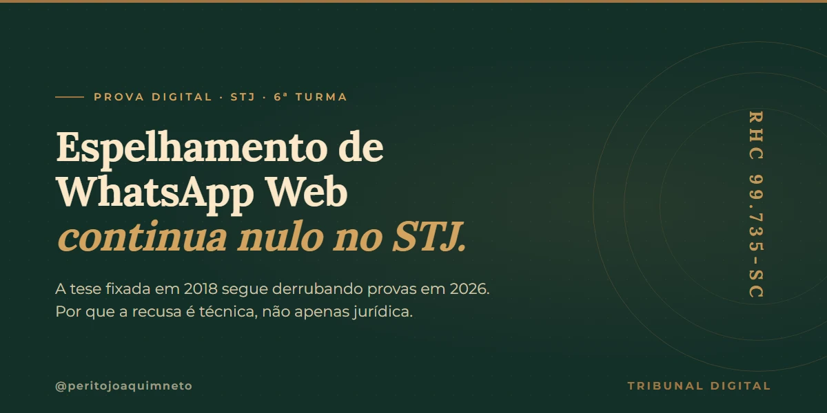 Em 27 de novembro de 2018, no julgamento do RHC 99.735-SC, a Sexta Turma do Superior Tribunal de Justiça fixou tese de que decisão judicial autorizando espelhamento de conversas via WhatsApp Web é ilegal e que a prova produzida a partir dela é nula. Em 2021, no RHC 133.430-PE, a mesma Turma reafirmou o entendimento. Em 2026, ele segue sendo aplicado em decisões correntes envolvendo extrações de aparelhos celulares e relatórios periciais que, com frequência, ainda invocam essa modalidade de coleta sem distinguir tecnicamente o que se está apresentando.