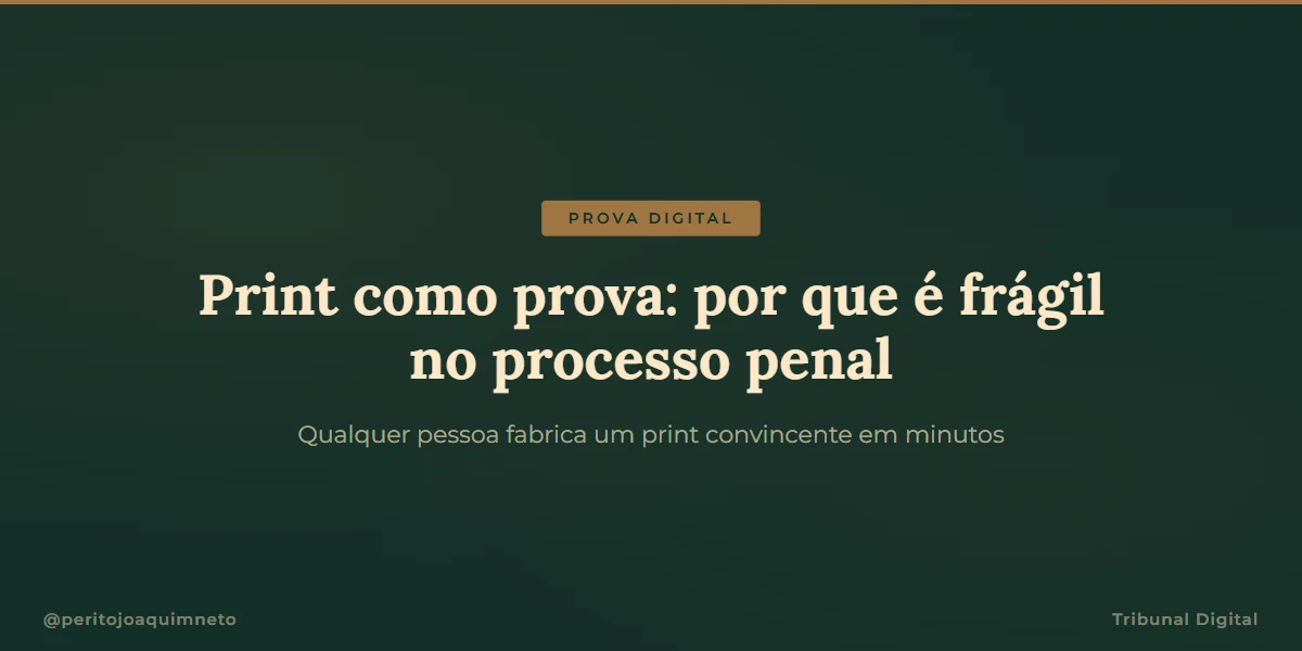 Um print de conversa de WhatsApp chega ao processo criminal como se fosse documento oficial. A acusação apresenta, o juiz aceita, e a defesa muitas vezes nem questiona. Mas usar print como prova sem verificar sua origem é o mesmo que aceitar um documento sem assinatura, sem data e sem garantia de que ninguém alterou o conteúdo.