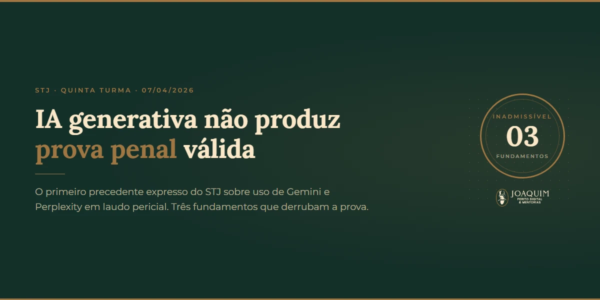 O STJ acabou de fixar, de forma expressa, que IA generativa não produz prova penal admissível. A decisão saiu em 07/04/2026, da Quinta Turma, com relatoria do Min. Reynaldo Soares da Fonseca, e nasceu de um caso concreto de injúria racial em estádio no qual um relatório técnico fundamentado em Gemini e Perplexity foi juntado aos autos como perícia. A defesa recorreu, o STJ anulou a prova e consolidou três fundamentos que, a partir de agora, passam a ser ferramenta obrigatória no repertório do advogado criminalista que atua em casos com mídia digital.